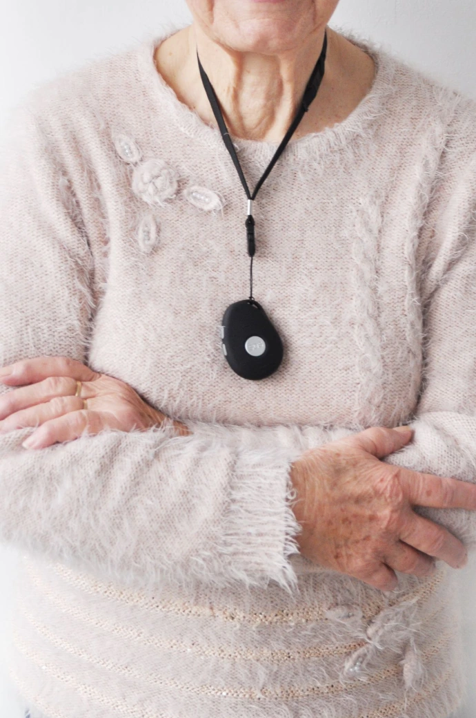 De mobiele alarmknop is een klein, draagbaar toestel dat je overal kan meenemen. We hebben twee soorten: een toestel om de hals en een polshorloge. Dit toestel werkt overal in België. De zorgcentrale kan je aanspreken via jouw alarmknop. Aan de hand van GPS-signalen kunnen zij jouw exacte locatie bepalen.